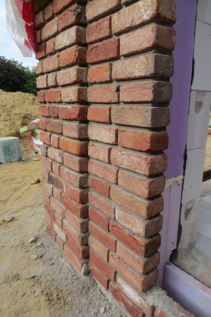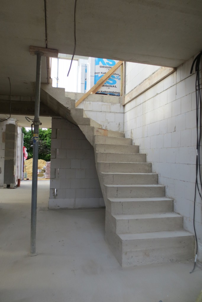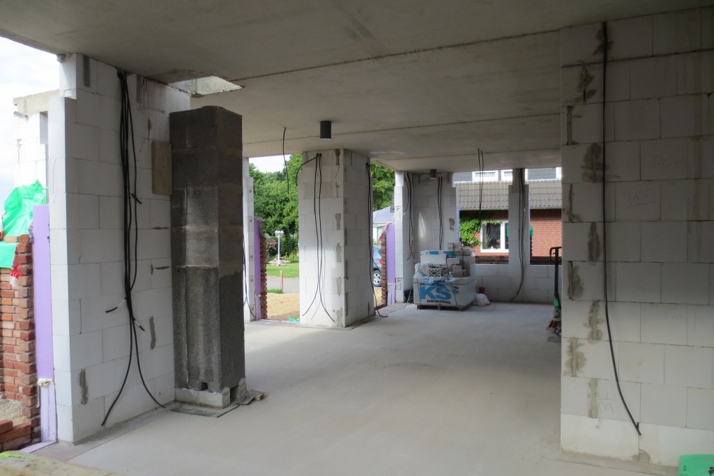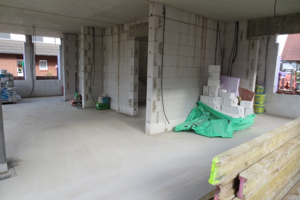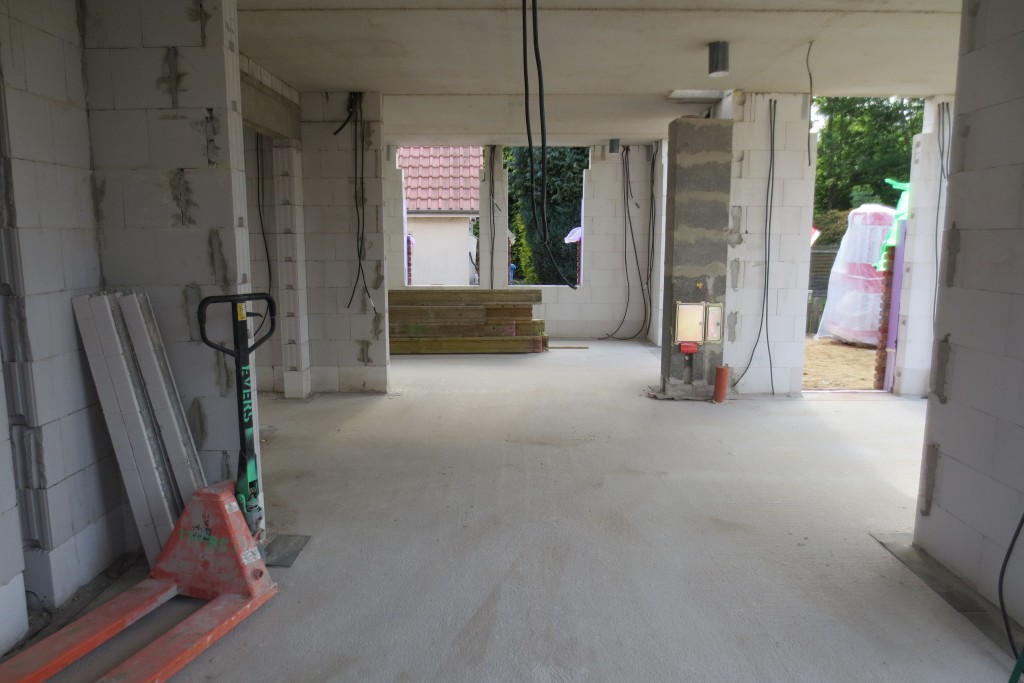 Inzwischen sind die Stützbalken weitestgehend entfernt und einmal durchgefegt. Sieht gleich ganz anders aus. Die Ecken des Hauses wurden auch bereits zum Teil gemauert und stehen ein Stück hervor (Lisenen). Und auch der Kamin steht nun da wo er hin soll.