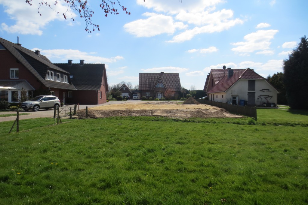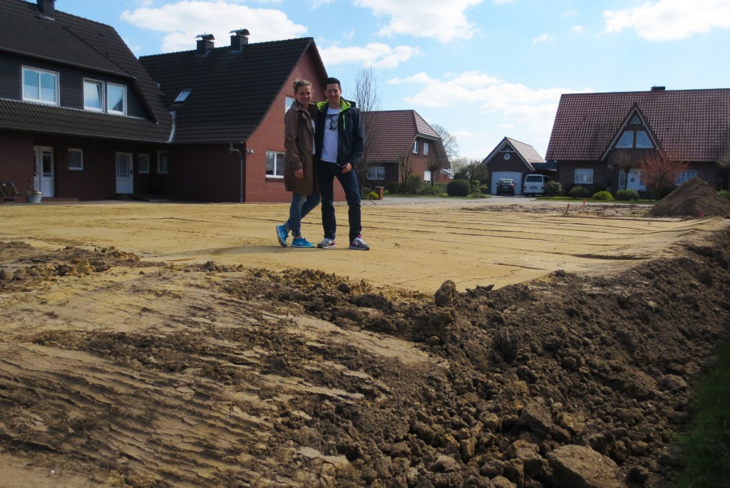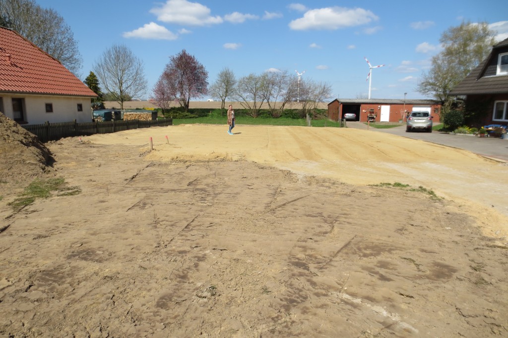 Der Boden ist bereit unser Haus zu tragen 18. April 2015Carola & Sebastian Der Sandkasten ist inzwischen fertig befüllt. Die Bagger sind übers Wochenende also erst mal wieder weg. Montag geht mit Abstecken weiter.