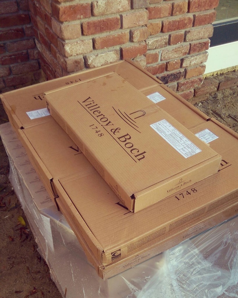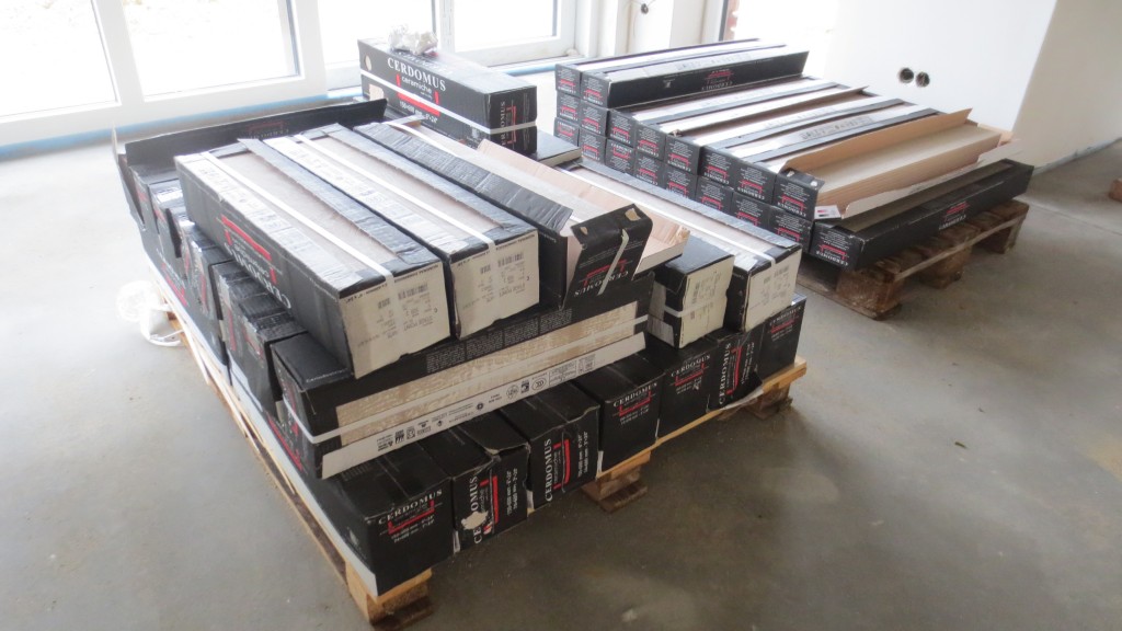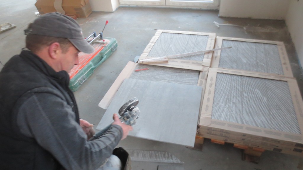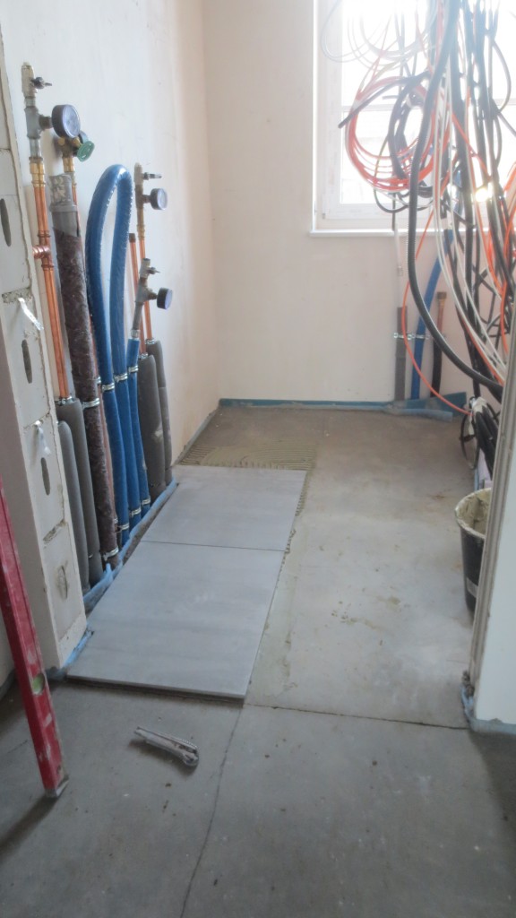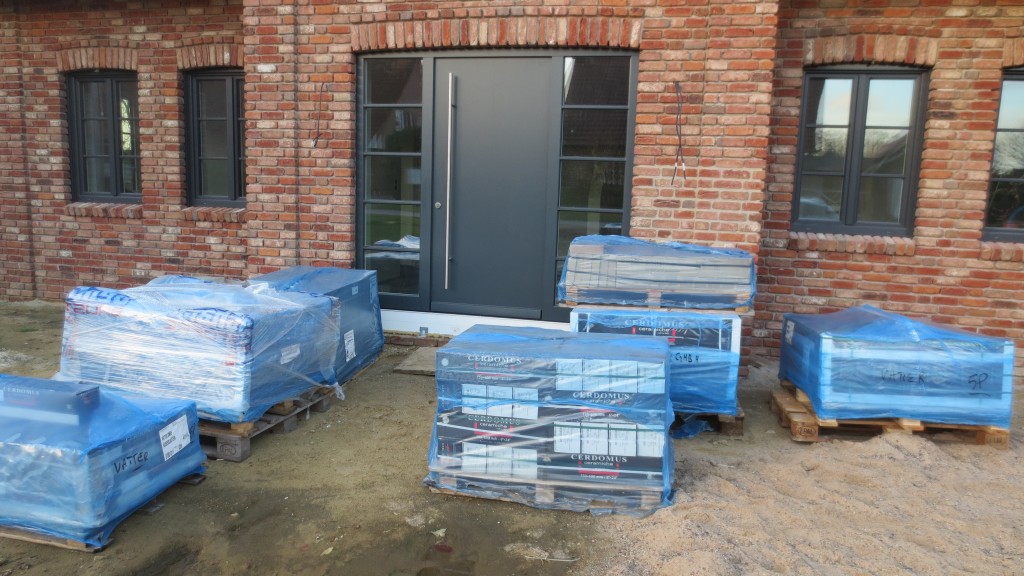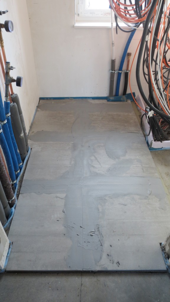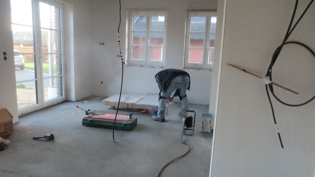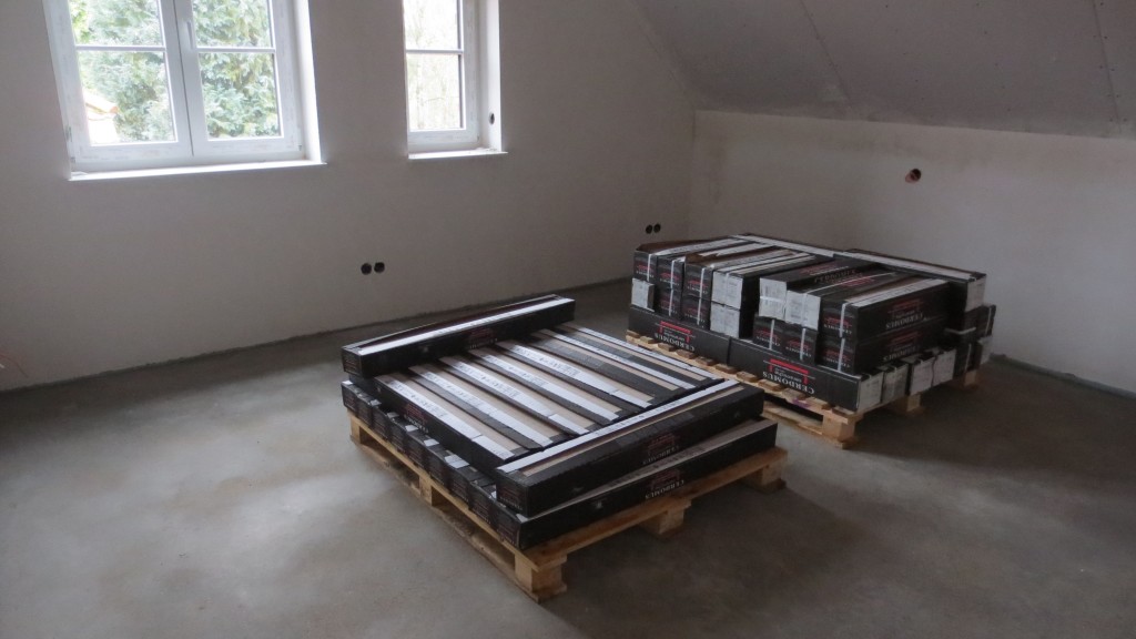 Gestern sind die Fliesen gekommen. Für Carola wie Weihnachten. Jeden Karton auspacken und sich freuen. Und wir mussten wirklich jeden Karton anfassen, da wir sie einzeln ins Haus tragen und auf die Räume verteilt haben. Waren auch nur 2 Fliesen beschädigt – bei der Menge verschwindend wenig. Natürlich haben wir die Bodenfliesen überall schon mal angehalten und Probe gelegt. Der Fliesenleger konnte dann heute auch direkt loslegen und die ersten Fliesen in den Hausanschlussraum legen – da ja nächste Woche die Hausanschlüsse kommen sollen und folgend auch der Wasserspeicher aufgestellt und angeschlossen wird. Dann können wir endlich die Heizung starten – wobei uns die Temperaturen derzeit ja in die Karten spielen. Zuvor mussten wir in dieser Woche natürlich sicherstellen, dass die Heizung auch dicht ist. Allerdings war der Druck auch beim Abdrücken mit Wasser nach zwei Tagen wieder auf Null. Eine feuchte Stelle konnten wir im Estrich aber nicht wirklich ausmachen. Also nochmal mit mehr Druck neu abgedrückt – und siehe da, am Verteilerkasten selbst fing es kontinuierlich an zu tropfen. Heinz hat dann mit seiner großen Rohrzange und viel Kraft die Verbindungen nochmal richtig nachgezogen. Nun scheint alles dicht. Hoffen wir, dass das die Stelle war und der Druck bestehen bleibt. Nächste Woche also weiter mit Strom, Wasseranschluss und Gipsen der Decken.