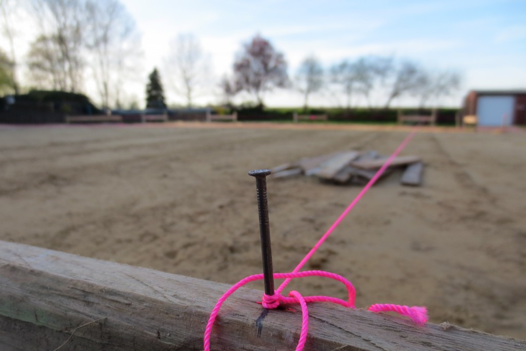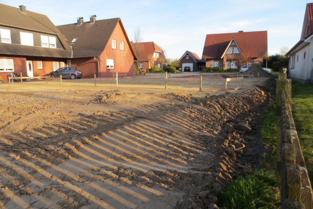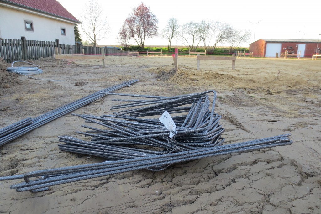 Die Schnüre sind gespannt – wir auch 20. April 2015Carola & Sebastian Das Haus ist inzwischen fast fertig abgesteckt. Das Eisen zur Bewehrung liegt bereit.