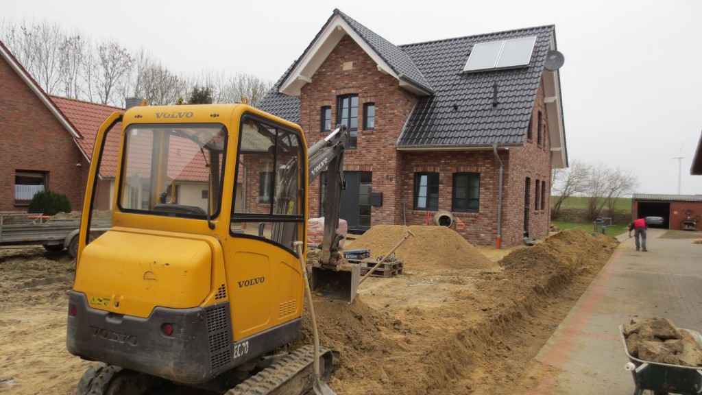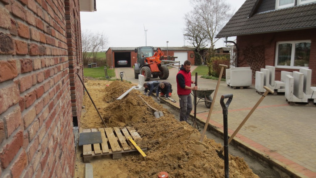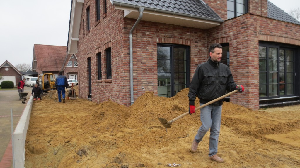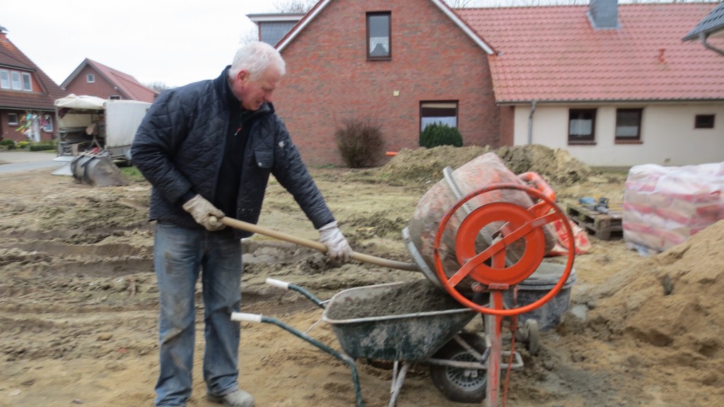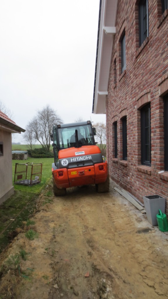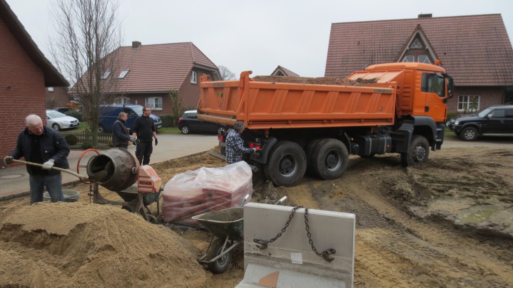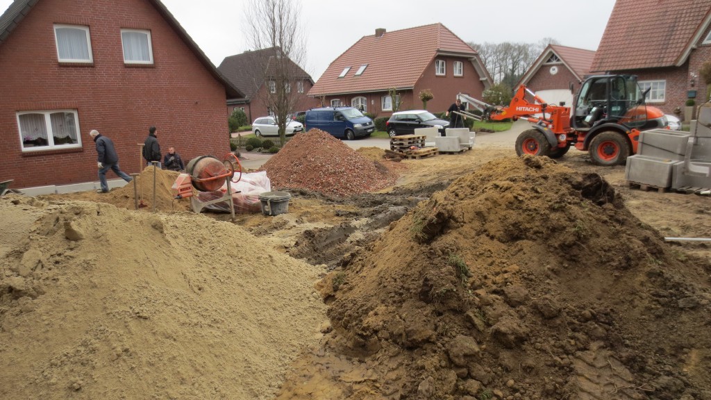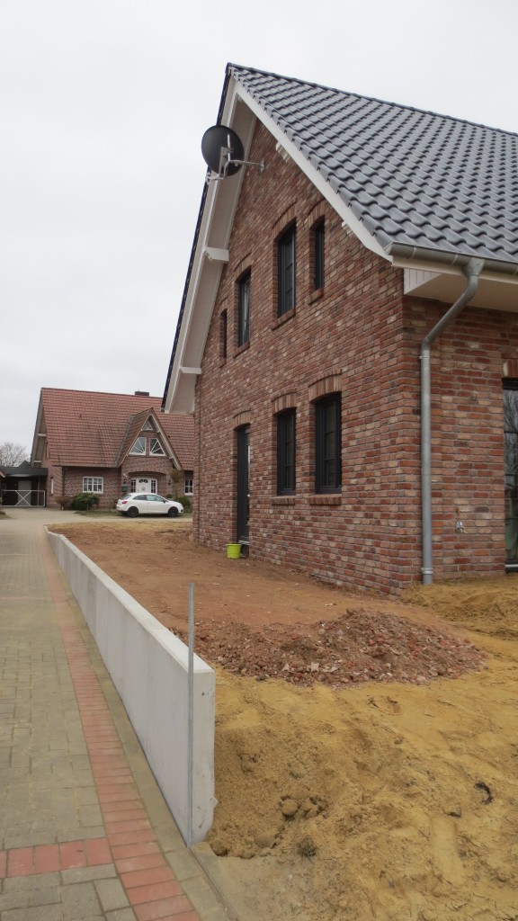 Nun geht es auch endlich vor dem Haus weiter. Es wird gebaggert, Mischung gemacht und Steine geschleppt. Wobei die L-Steine mit 167 Kg nur vom Bagger bewegt werden können. Und auch die Verteilung von Füllsand und dem Schotterunterbau erfolgt mit schwerem Gerät. Aber Schaufel und Schubkarre waren ebenfalls permanent im Einsatz an diesem Wochenende – wie man im Zeitraffervideo sieht. Ergebnis: Die Grundstücksgrenzen sind mit Winkelstützen abgefangen und die Einfahrt neben dem Haus zum Pflastern vorbereitet. Nach Ostern geht es dann mit den Auffahrten und Wegen weiter – anschließend können unsere Pflastersteine kommen.