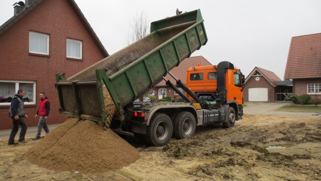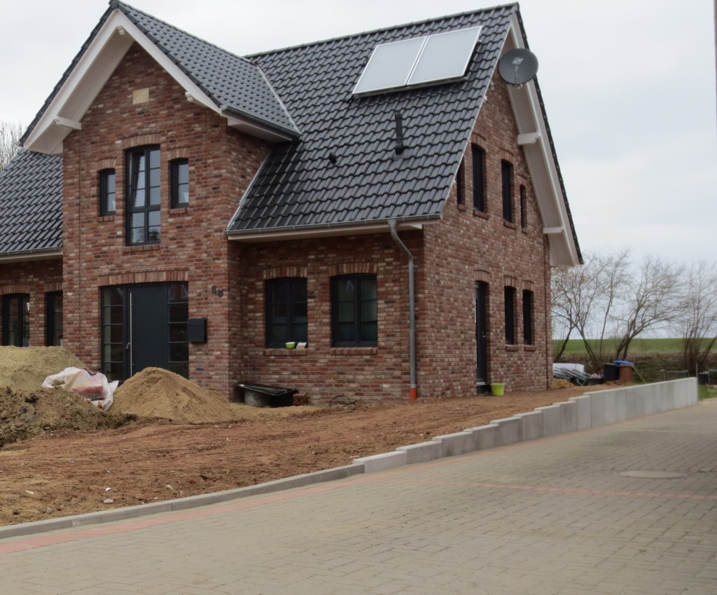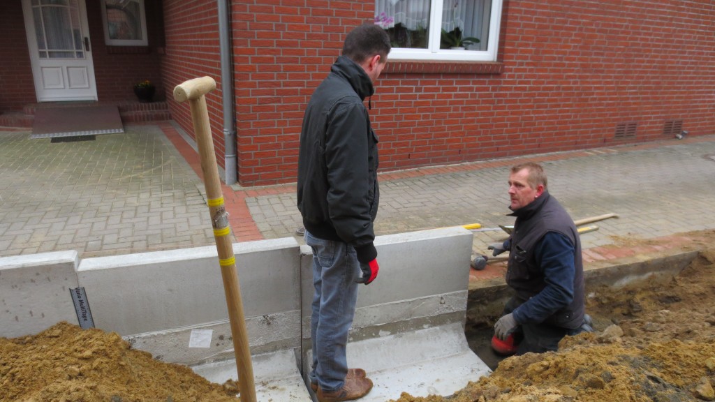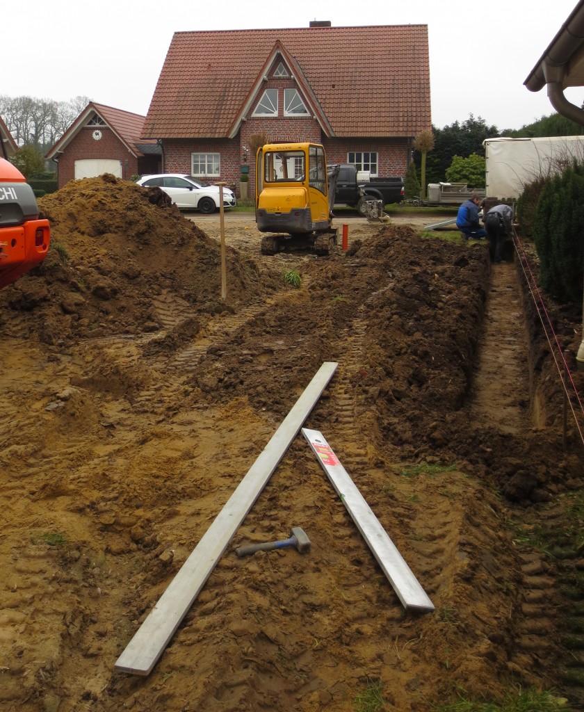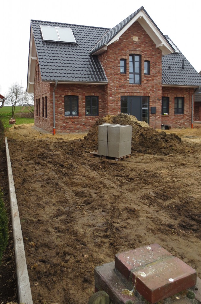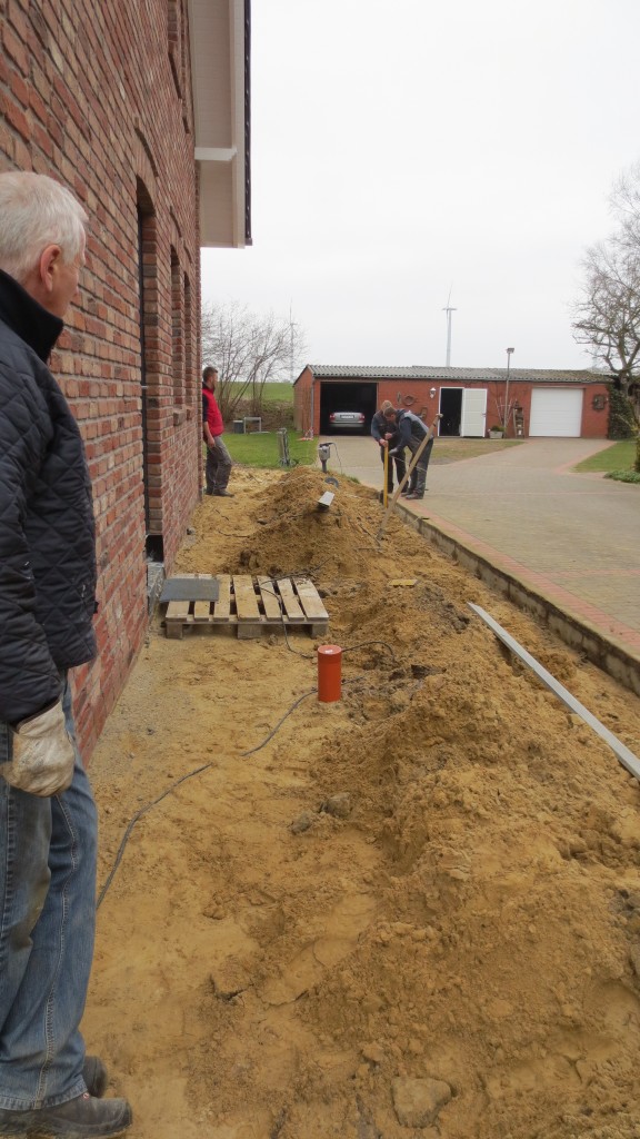 Nun geht es auch endlich vor dem Haus weiter. Es wird gebaggert, Mischung gemacht und Steine geschleppt. Wobei die L-Steine mit 167 Kg nur vom Bagger bewegt werden können. Und auch die Verteilung von Füllsand und dem Schotterunterbau erfolgt mit schwerem Gerät. Aber Schaufel und Schubkarre waren ebenfalls permanent im Einsatz an diesem Wochenende – wie man im Zeitraffervideo sieht. Ergebnis: Die Grundstücksgrenzen sind mit Winkelstützen abgefangen und die Einfahrt neben dem Haus zum Pflastern vorbereitet. Nach Ostern geht es dann mit den Auffahrten und Wegen weiter – anschließend können unsere Pflastersteine kommen.