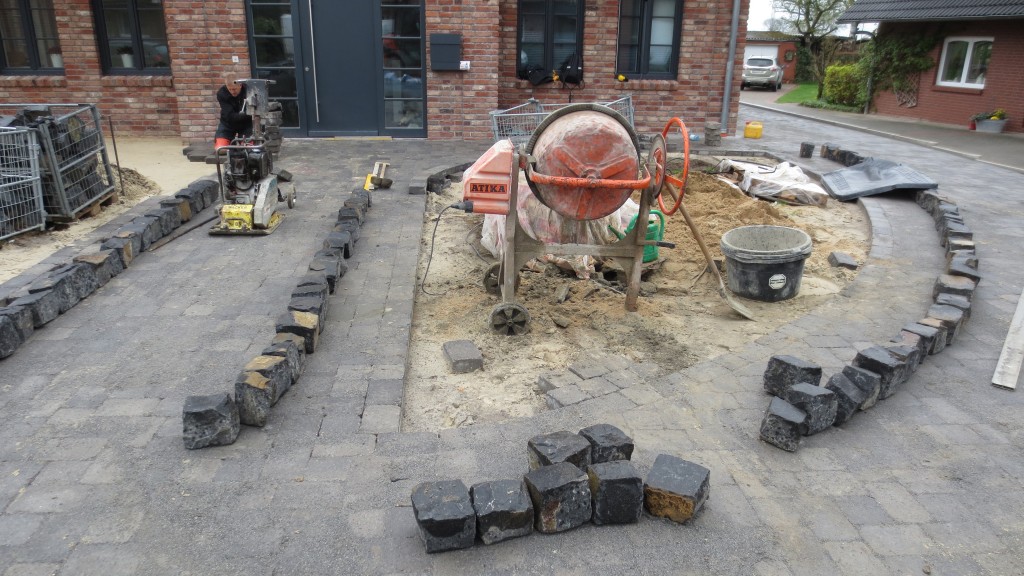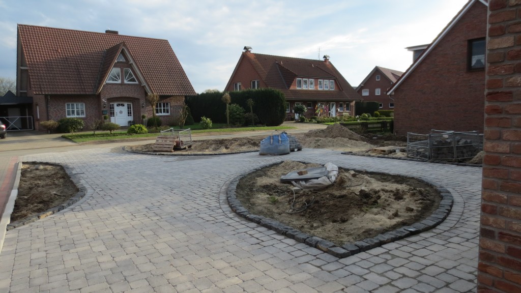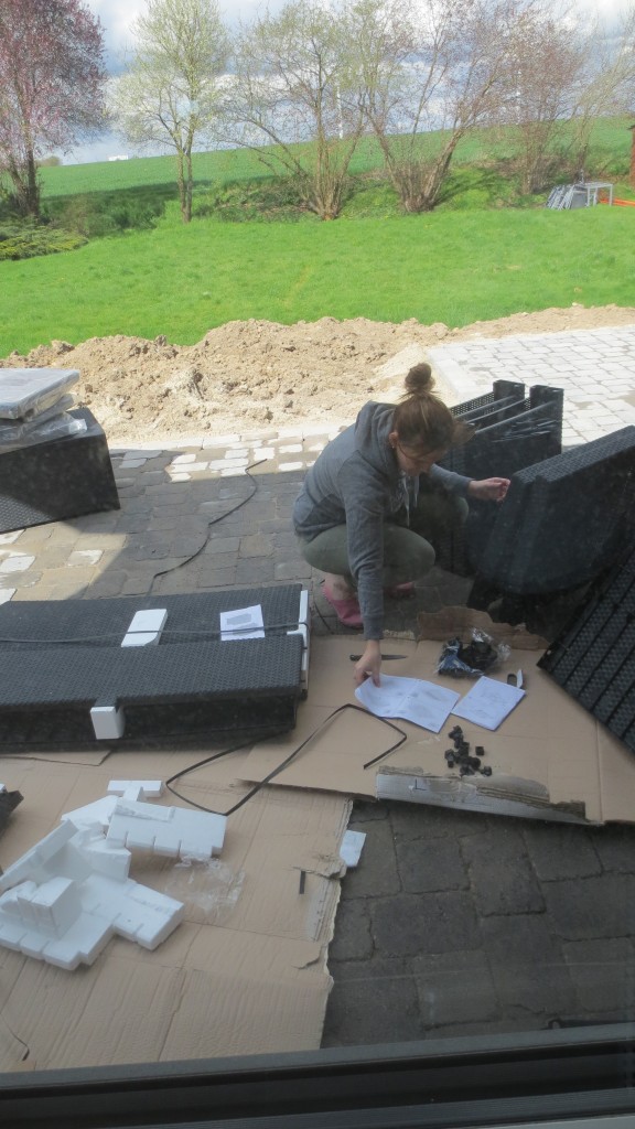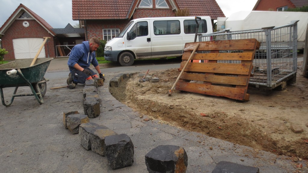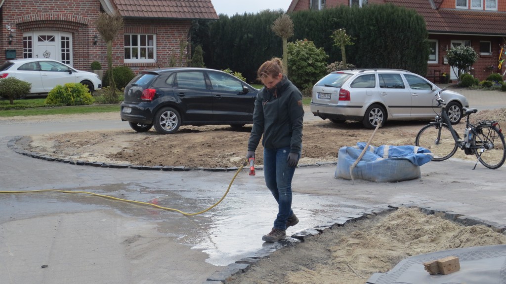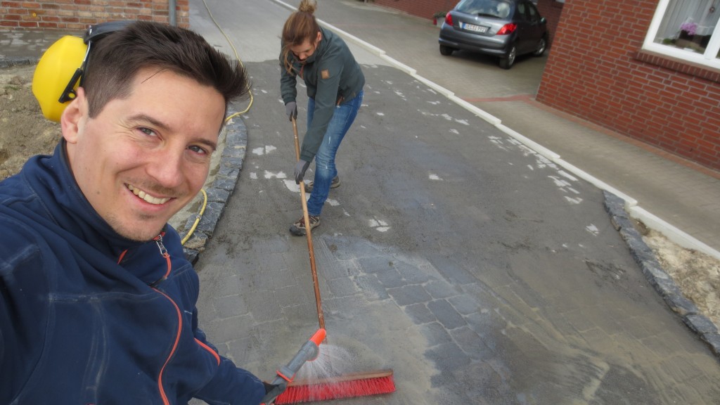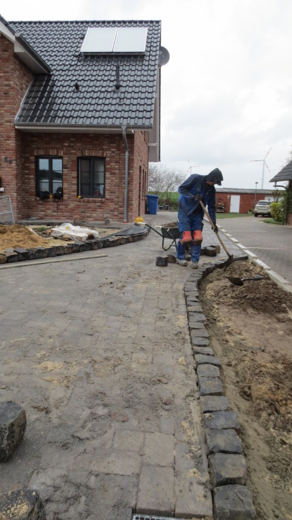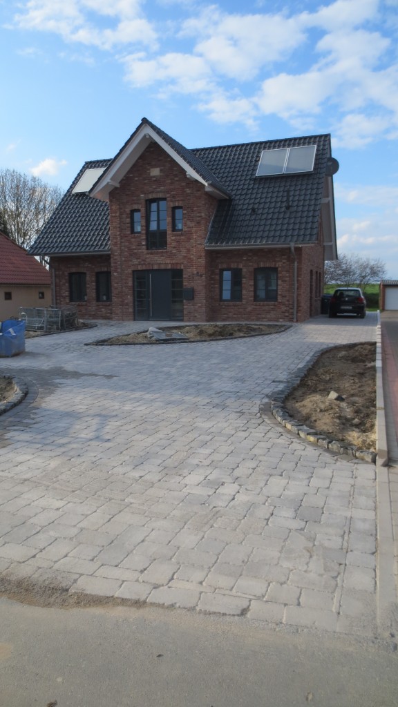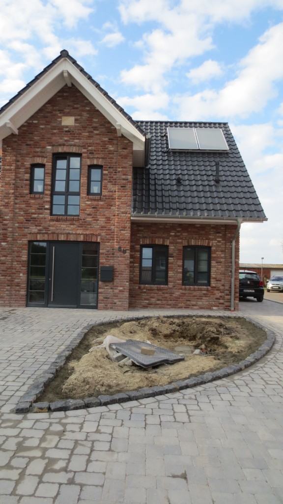 Unsere Einfahrt ist befahrbar. Endlich können wir mit unseren Autos direkt vor dem Haus stehen und sauberen Fußes eintreten. Die Kantensteine sind in Zement gesetzt und geben unserem Pflaster den nötigen Halt. Die Zwischenräume schlemmen wir in den letzten Tagen immer wieder mit Split aus. Hoffen wir, dass da kein Unkraut so schnell durchkommt – sonst haben wir bei der Fläche einiges zum zupfen. Auch die Terrasse ist bereits ausgelegt und nach dem Aufbau der Gartenmöbel konnten wir bereits unseren ersten Kaffee im eigenen Garten schlürfen. Die letzten Anschlüsse auf dem Dach für die Lüftung haben wir Dank Unterstützung von Tobi ebenfalls abgeschlossen und auch die Solaranlage wurde nochmal nachjustiert. Der Gasverbrauch sollte sich somit bald komplett einstellen. Vorausgesetzt der Sommer setzt sich mal so langsam durch. Für die dunklen Stunden haben wir uns inzwischen für Außenleuchten entschieden. Freut euch mit uns auf die ersten Nachtaufnahmen unseres Hauses.