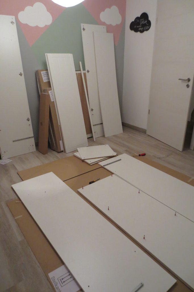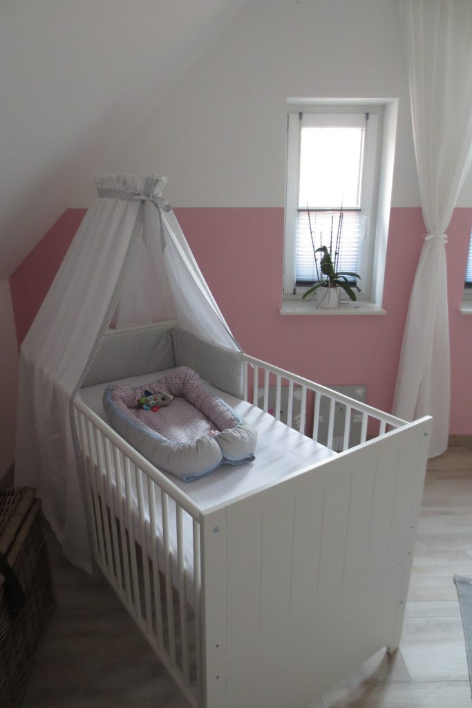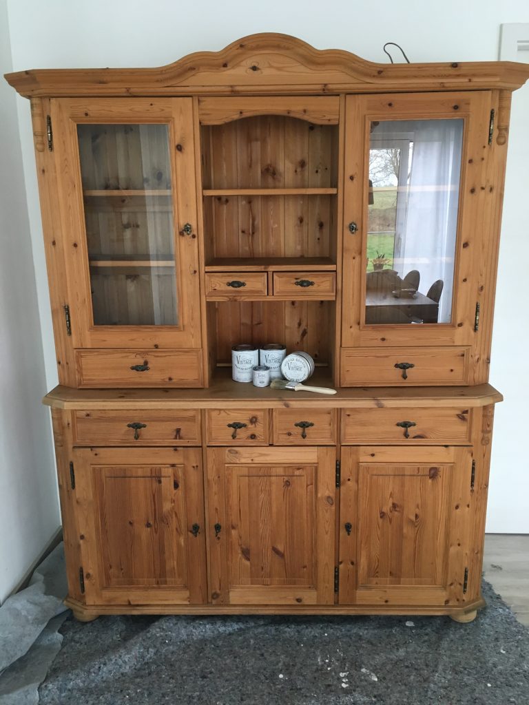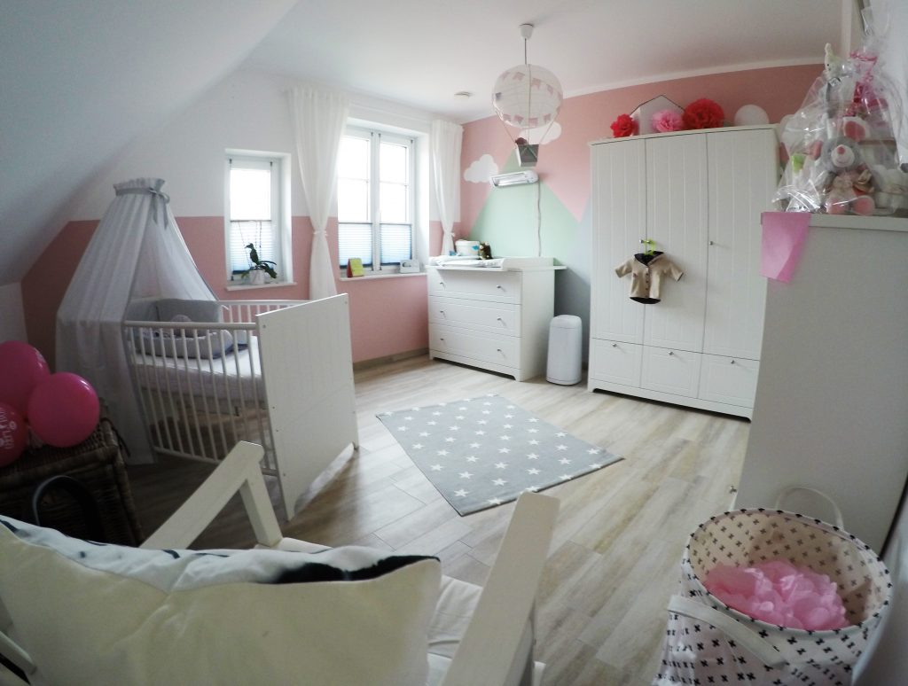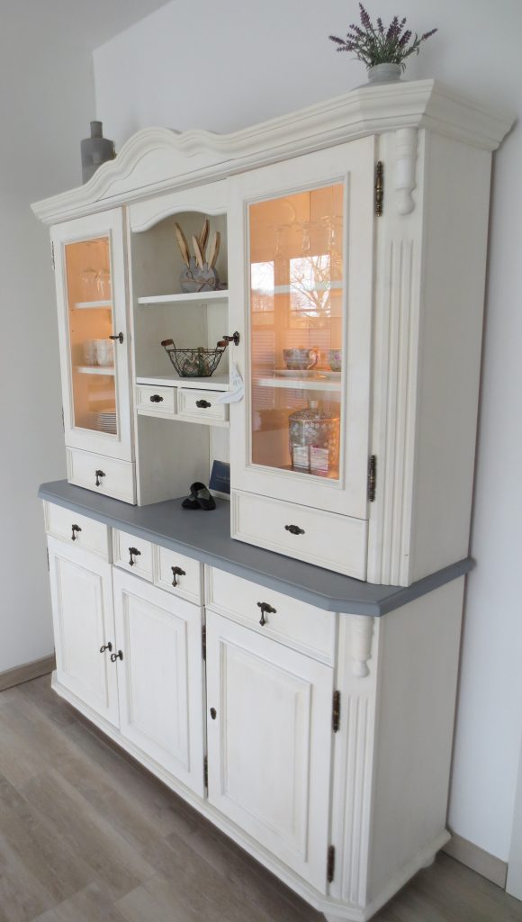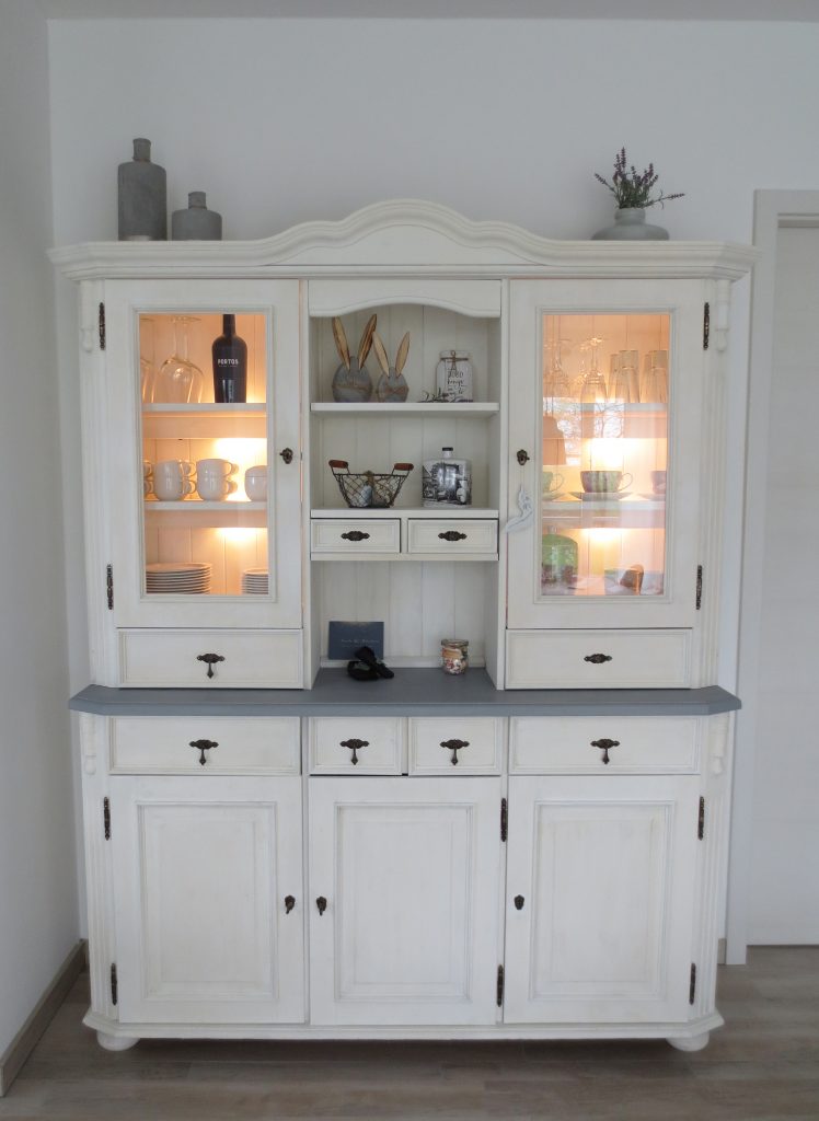 Das neue Jahr wird nicht weniger spannend als das letzte: Wir erwarten Nachwuchs. Entsprechend bereiten wir auch unser Haus auf den neuen Erdenbürger vor. Unser Gästezimmer musste damit umziehen und Platz machen für das Kinderzimmer. Hier darf auch mal ein bisschen mehr Farbe ins Spiel kommen. Obgleich wir eigentlich auf zu viel rosa verzichten wollten – ist am Ende doch einiges von der Farbe ins Zimmer gekommen. Wir sind auf jeden Fall happy und voller Vorfreude. Aber auch im Esszimmer hat sich wieder was getan – wir haben endlich den passenden Schrank für die freie Wand vor der Schiebetür gefunden. Bevor dieser aber im Vintage-Shabby-Chic-Look erstrahlt, war doch deutlich mehr Arbeit notwendig als gedacht. Mit Kreidefarbe von Jeannedarcliving haben wir aber genau den Effekt erreicht, der uns gefällt. Mit der Beleuchtung ist der Schrank nun zu einem richtigen Highlight und Kontrast im Erdgeschoss geworden.