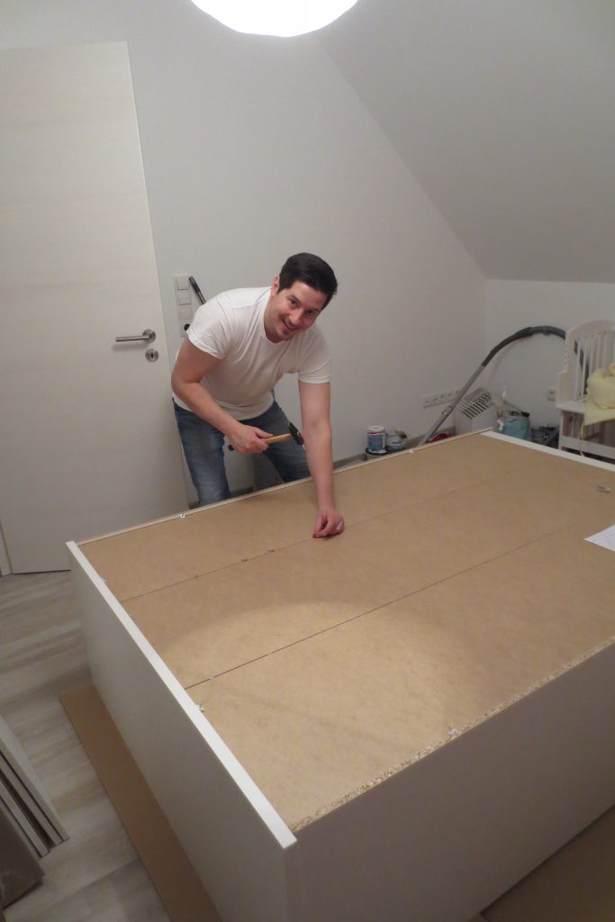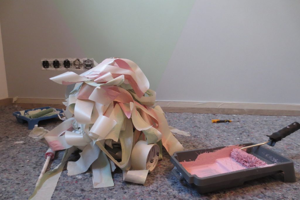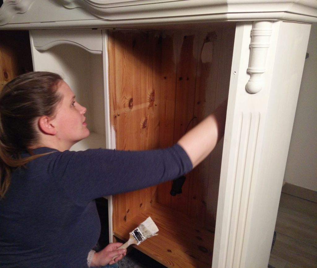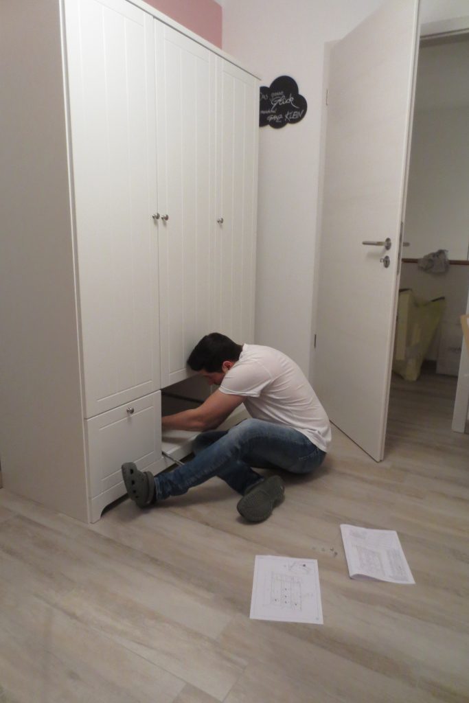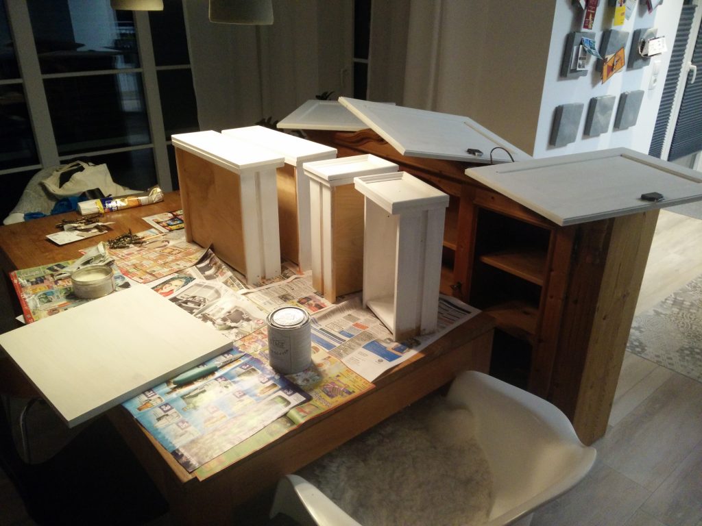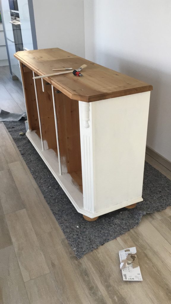 Das neue Jahr wird nicht weniger spannend als das letzte: Wir erwarten Nachwuchs. Entsprechend bereiten wir auch unser Haus auf den neuen Erdenbürger vor. Unser Gästezimmer musste damit umziehen und Platz machen für das Kinderzimmer. Hier darf auch mal ein bisschen mehr Farbe ins Spiel kommen. Obgleich wir eigentlich auf zu viel rosa verzichten wollten – ist am Ende doch einiges von der Farbe ins Zimmer gekommen. Wir sind auf jeden Fall happy und voller Vorfreude. Aber auch im Esszimmer hat sich wieder was getan – wir haben endlich den passenden Schrank für die freie Wand vor der Schiebetür gefunden. Bevor dieser aber im Vintage-Shabby-Chic-Look erstrahlt, war doch deutlich mehr Arbeit notwendig als gedacht. Mit Kreidefarbe von Jeannedarcliving haben wir aber genau den Effekt erreicht, der uns gefällt. Mit der Beleuchtung ist der Schrank nun zu einem richtigen Highlight und Kontrast im Erdgeschoss geworden.