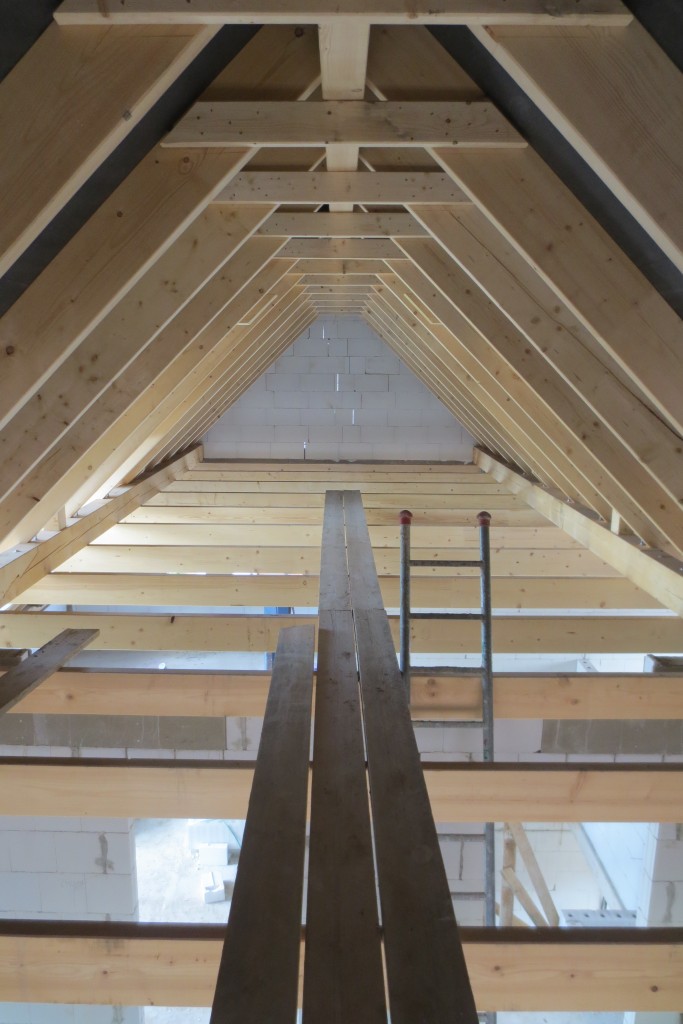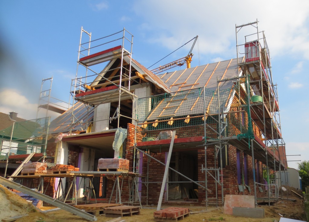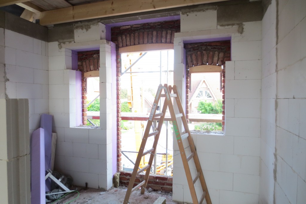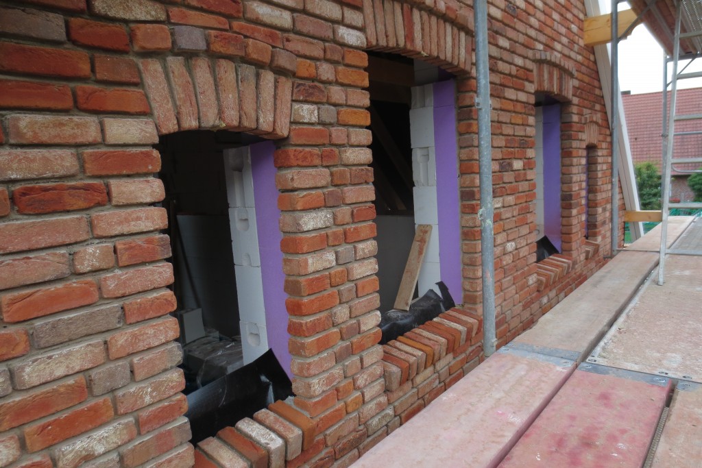 Das Wetter in den letzten Tagen ließ uns nur langsam voran kommen. Inzwischen sind die ersten Seiten des Verblenders aber beim Dach angekommen. Jahresstein ist am Platz und auch die Fenster können jetzt ausgemessen und bestellt werden. Dann kann es endlich innen weiter gehen. Haben ja bald Urlaub – dann können wir ordentlich was vorwärts bringen.