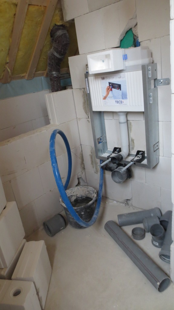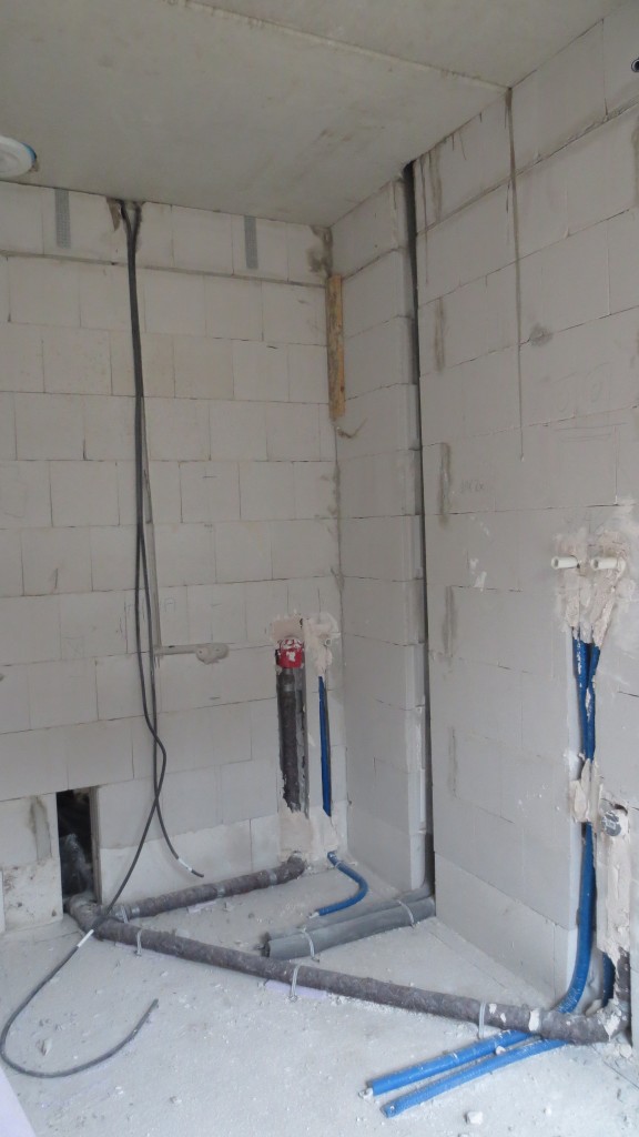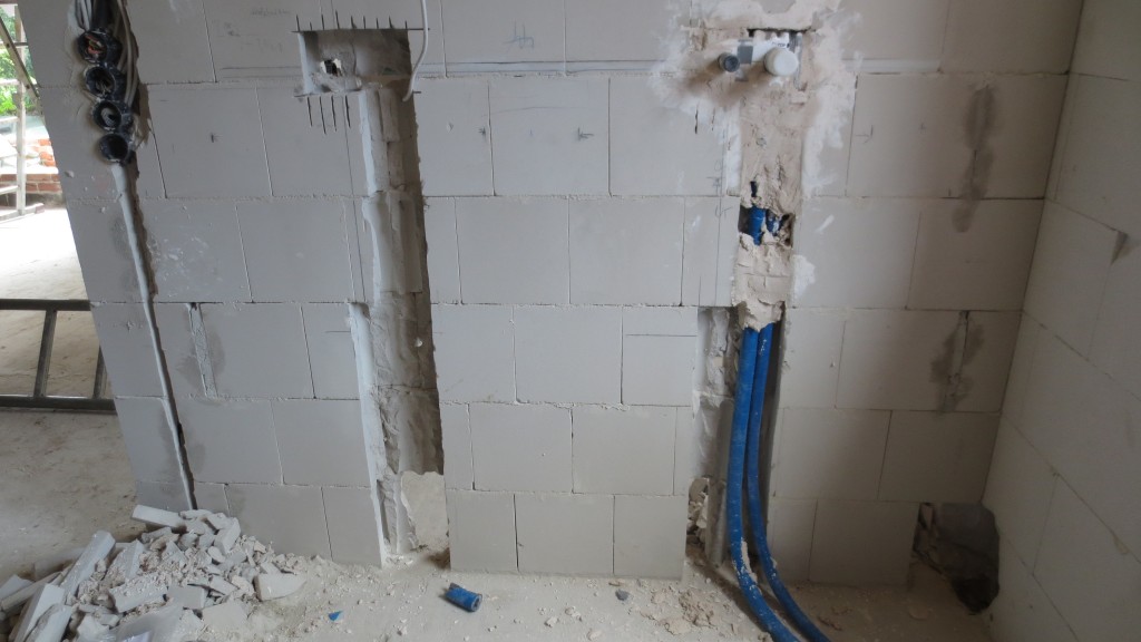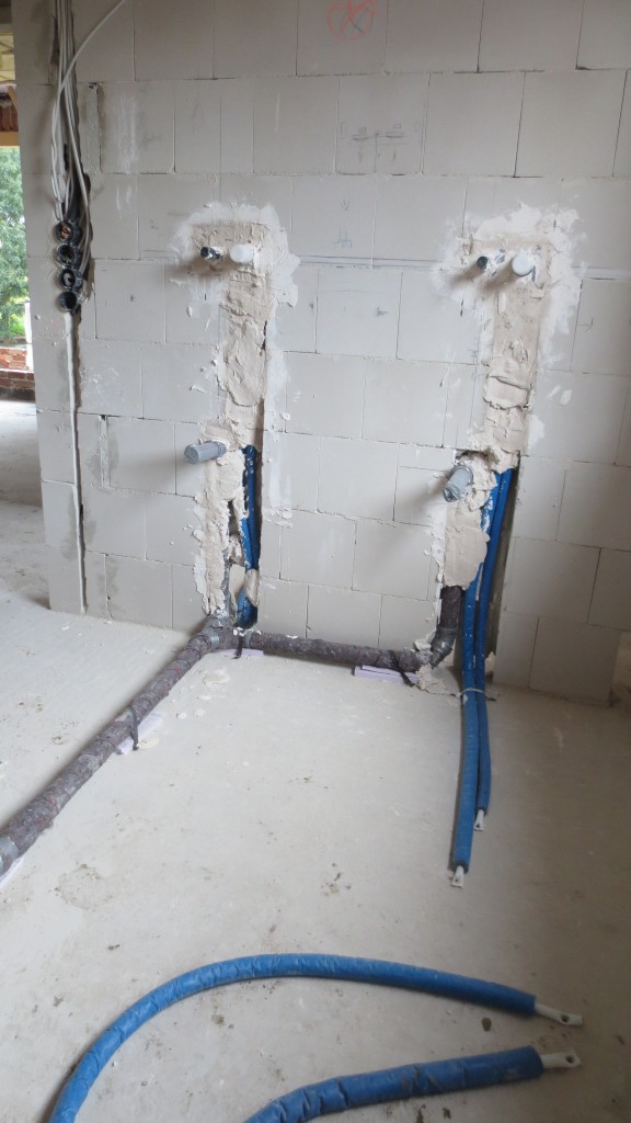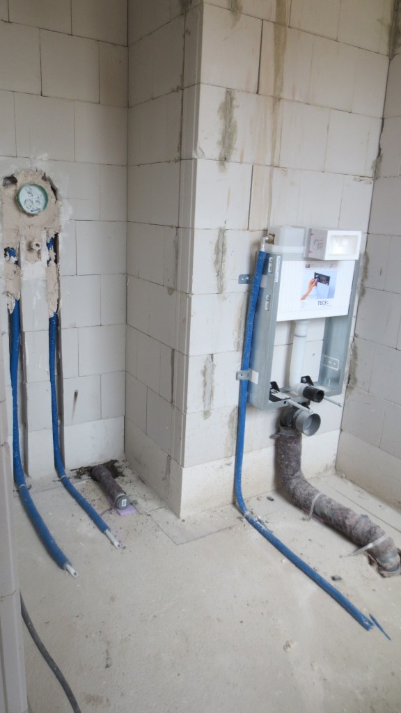 Endlich sind wir mit dem Schlitzen und Kabeln auch im Erdgeschoss fast komplett durch. Auch der Termin für die Montage der Fenster steht endlich: nächstes Wochenende ist es soweit. Und direkt im Anschluss soll verputzt werden. Das heißt für uns aber auch, dass bis dahin alles fertig sein muss. Die Sanitäranlagen wurden diese Woche bereits vorbereitet – alles an seinem Platz (auch wenn es zwischendurch ein bisschen hin- und her mit den genauen Abständen und Anordnungen gab). Die nächsten beiden Wochen werden aber nochmal sportlich: Kabel fertig ziehen, Fenster final abdichten und einbauen, Rigipsdecke oben anbringen, Fensterbänke einbauen und noch alle Abmauerungen in den Bädern und dem Hausanschlussraum. Also…weiter gehts.