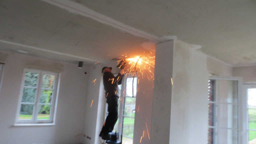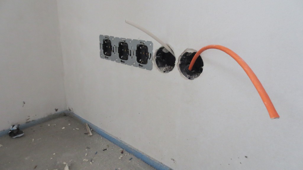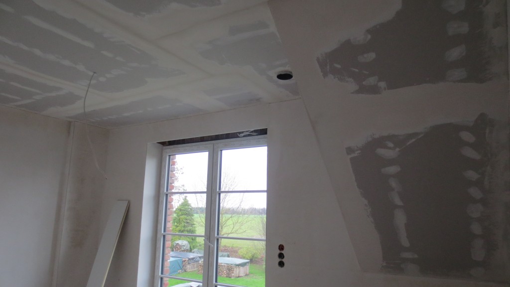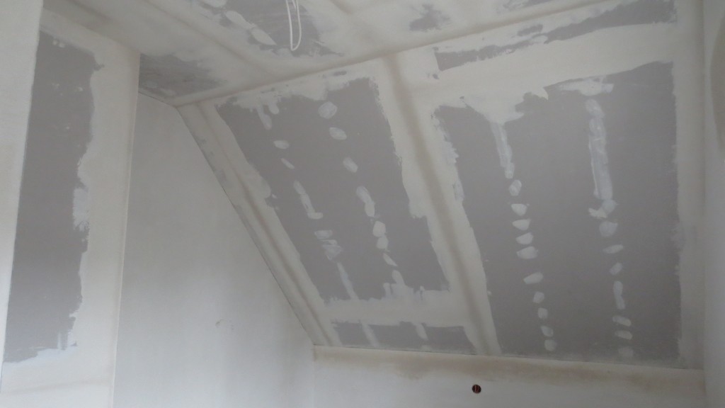 Spachteln ist eine der wenigen Arbeiten, die wir nicht selbst machen wollten. So schnell, gerade und gleichmäßig bekommt man das glaube ich auch nur mit viel Übung hin – und zu dem Thema haben uns viele Häuslebauer ihr meistes Leid geklagt. Damit sind nun bereits alle Decken 2mal gespachtelt. Sobald das Heizprogramm startet, können wir mit dem Schleifen und der Vliestapete weiter machen. Wir nähern uns also den letzten Oberflächen – der Farbe. Steckdosen sind inzwischen auch zum Teil montiert, Entwirrung des Kabelsalats im Hausanschlussraum steht aber noch aus. Aber auch außen gilt es noch einiges zu erledigen, bevor der Winter einbricht: Bodentiefe Fenster abdichten, Oberflächenentwässerung und Fallrohre. Ganz zu schweigen vom Pflastern. Ab nächster Woche wird es aber endlich warm im Haus.