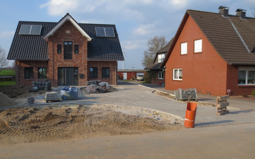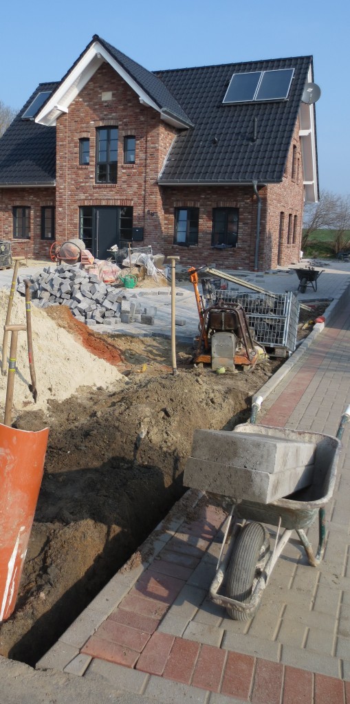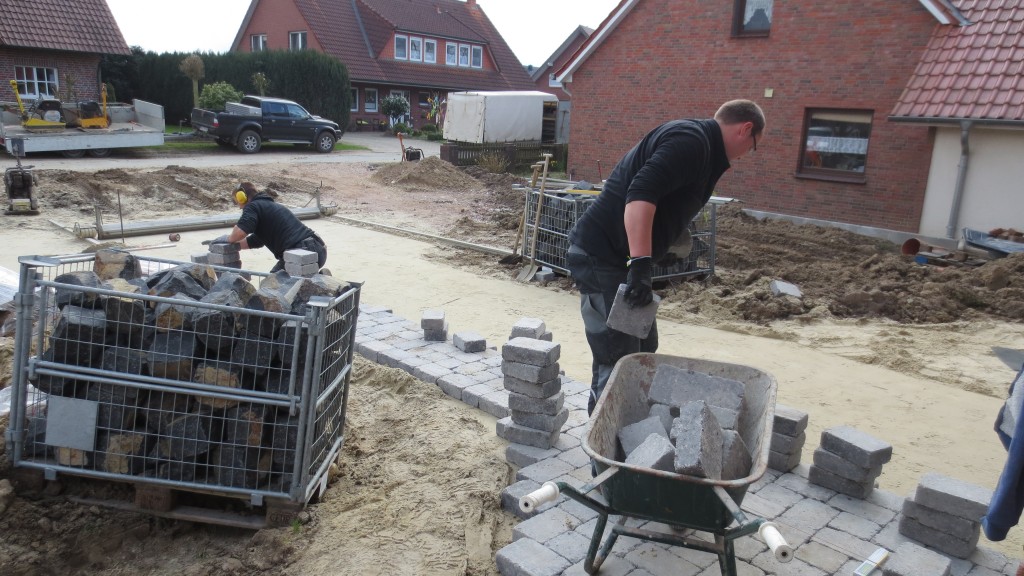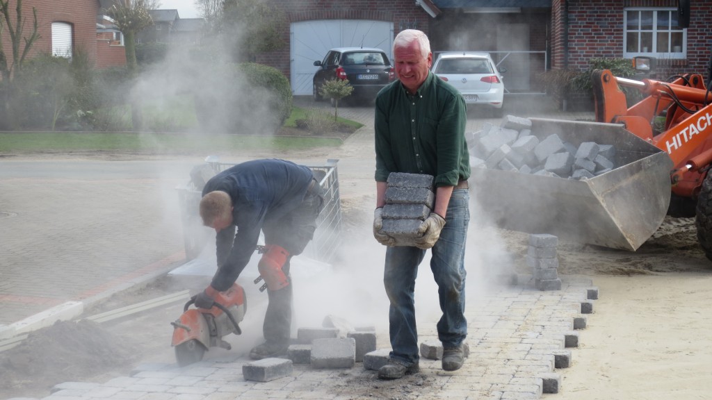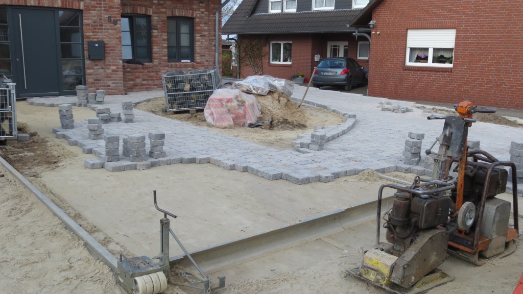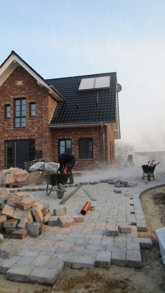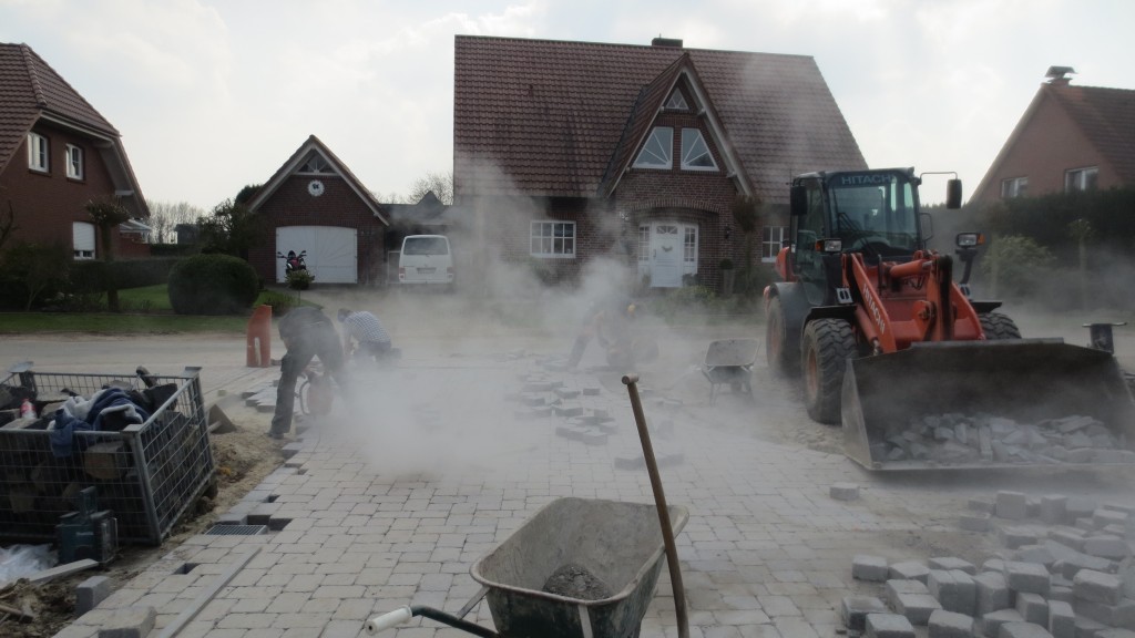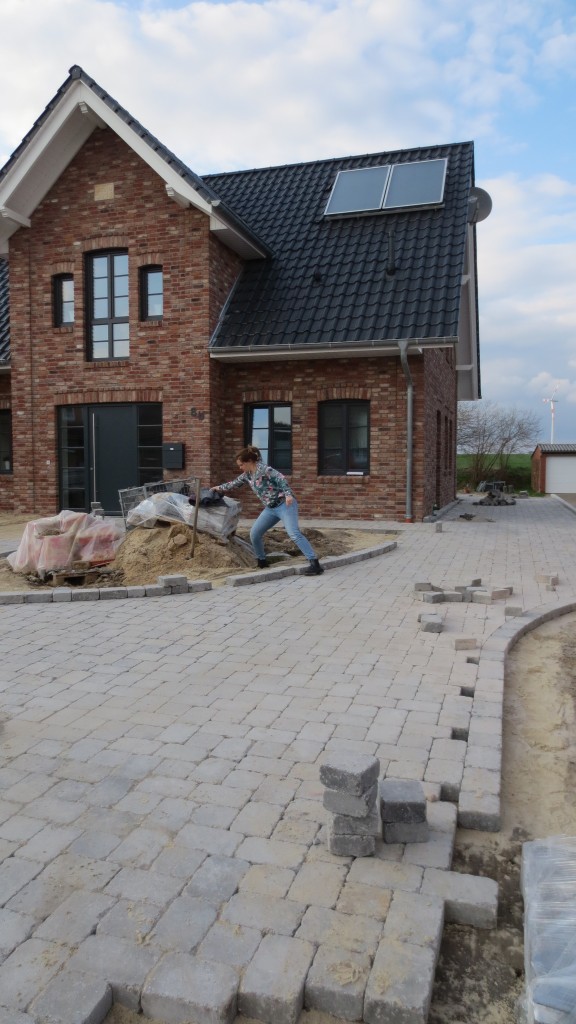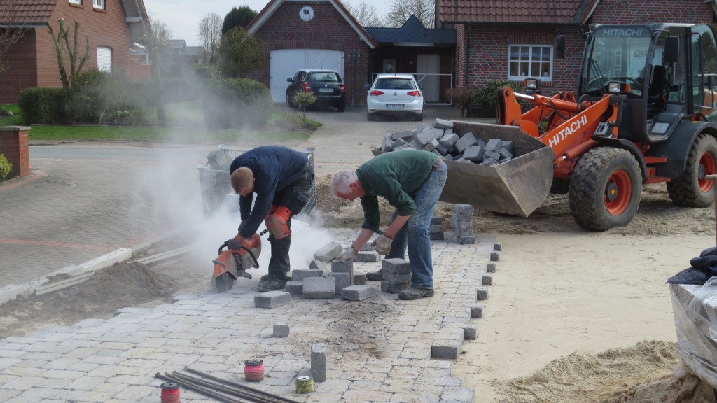 Wir sind gut vorangekommen in den letzten Tagen und auch das Wetter hat wieder mit gespielt. So konnte weiter verdichtet, abgezogen, Steine geschleppt und geflext werden was das Zeug hielt. Apropos eine Schaufel hat nicht gehalten – nachdem ich eine halbe Stunde das Regenabflussrohr im Boden gesucht habe und mich dabei durch bereits verdichteten Kies graben musste, hat die Schaufel aufgegeben. An dieser Stelle auch ein „Sorry“ an alle Nachbarn – der Flexstaub hat auch uns heute noch gut im Haus beschäftigt. Bei den Rundungen in der Einfahrt gab es aber auch einiges zu schneiden. Mit dem Ergebnis sind wir aber sehr zufrieden. Spannend wird es dann, wenn wir die Rundungen auf der anderen Seite genau gleich hinbekommen müssen. Nächste Woche aber erst einmal die Kantensteine, damit auch nichts mehr verrutschen kann.